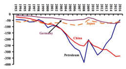 In 2016, Germany ran a current-account surplus of roughly €270 billion ($297 billion), or 8.6% of GDP, making it an obvious target of Trump’s ire. [Yet,… as a member of the eurozone, Germany has no exchange rate to manipulate; the European Union has anti-subsidy regulations; it is not that Germany discriminates against imports; it is irrelevant for welfare when countries run surpluses with some trade partners and deficits with others]