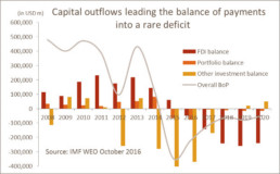 Economic rebalancing is underway as evidenced by the economy’s soft landing, a dominant services sector and steadily strengthening consumer demand. However, government policies don’t really point to a firm commitment to an economic model change. The transition to a consumption-led economy is far too slow, as demonstrated by China’s persistent reliance on domestic investments (still at a high 43.7% of GDP in 2016) and robust – but forecast to decrease – current account surplus. Shaken by a negative trend in net capital flows, the balance of payments has fallen into overwhelmingly negative territory since 2015 and is forecast to remain in deficit in the MLT. It reflects China’s structural developments, notably stronger Chinese FDI fuelled by increasing overseas acquisitions from Chinese groups expanding internationally, and a sustained capital flight since 2014.