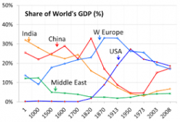 2/ %BDP sveta: Evropa je šele pred <200 leti prehitela Kitajsko. ZDA je šele po ww2 prehitela Evropo. Kmalu bodo vsi trije spet izenačeni